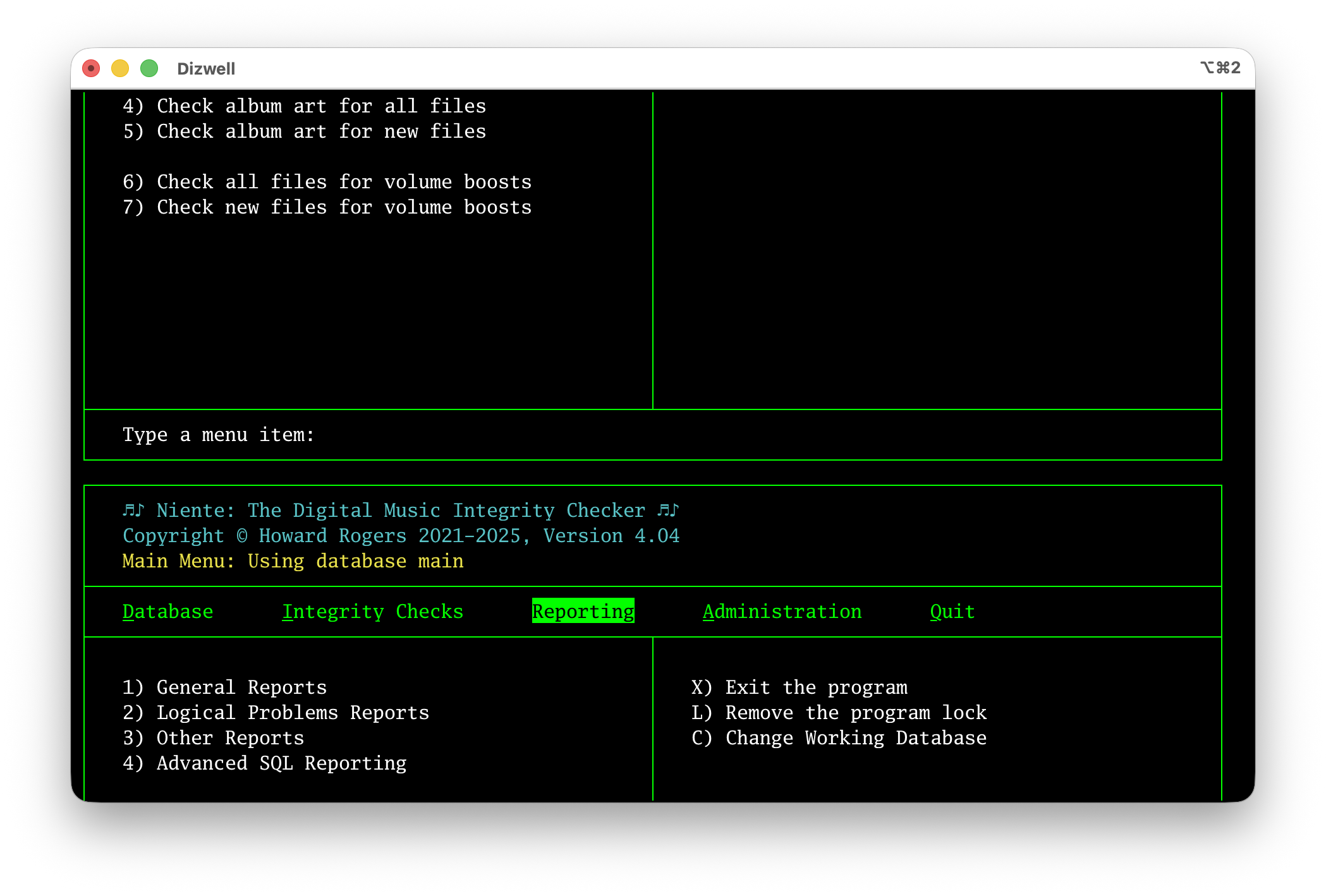 That's me sitting on the Reporting menu of Niente in the bottom part of the screen… but above it is a rendition of the screen when I was sitting on the Integrity Checks menu. Switching between menu items, in other words, creates an 'alternative screen' that is viewable if you scroll upward from the current screen. It is of no use to man or mouse (and WezTerm doesn't suffer from it!). Fortunately, it can be disabled in iTerm2: