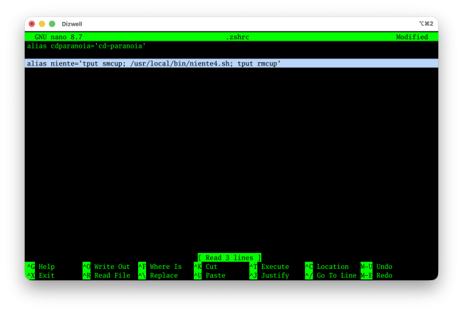 alias niente='tput smcup; /usr/local/bin/niente4.sh; tput rmcup'
