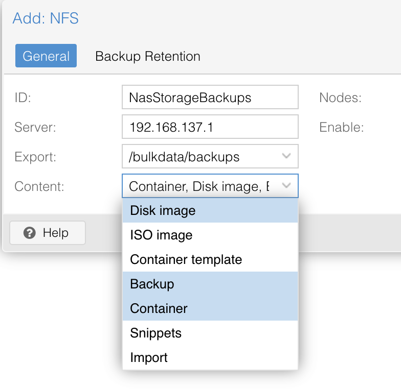 The 'Content' field is the important bit: it defines what Proxmox can store on the share and what it expects to find there (and what sub-folders it will create there). If you say content is 'backup', for example, it will create a 'dump' folder and your backups of containers and VMs will be stored there. If you want to upload an ISO to the NAS, that would require you to select the ISO Image content type, and so on.
