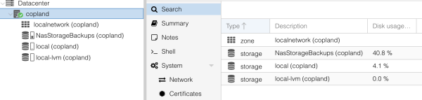 Managed network storage is created via the Proxmox web interface; unmanaged storage has to be created using the command line. Managed storage is what you want when you need to back up your containers and virtual machines: it's storage that Proxmox will create a number of folders in and keep an eye on automatically once it's been created. This is not, therefore, how you get NFS storage visible to containers and virtual machines: it's only network storage that the Proxmox host itself will be able to see and use.