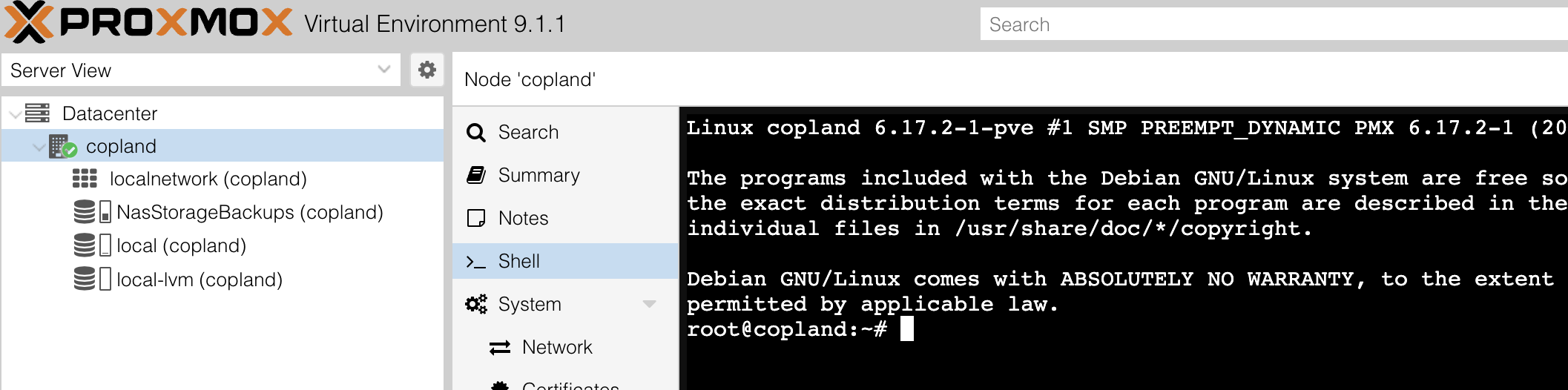 Once the container is built, go back to the Proxmox host's shell (that's Copland on my setup, then click Shell in the middle pane) and issue the command:
