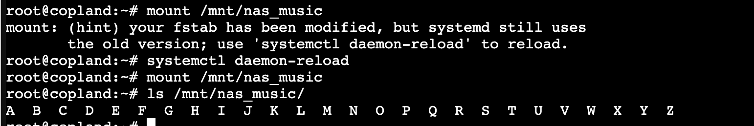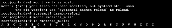 You will probably be told that “ount: (hint) your fstab has been modified, but systemd still uses the old version; use 'systemctl daemon-reload' to reload.” If you see that message, just issue these commands: