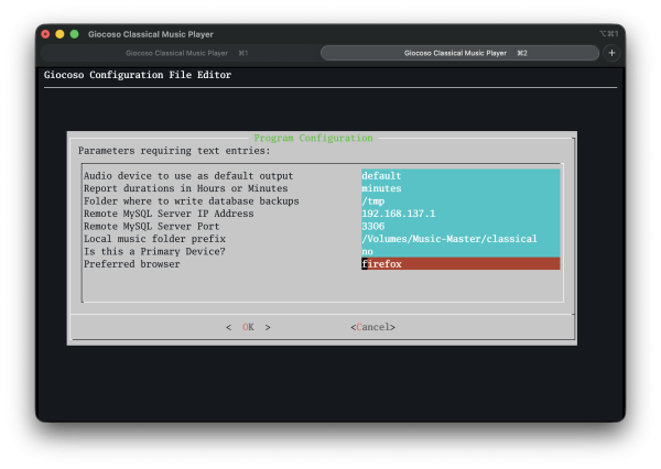 I have just released Giocoso Version 3.35, a few days earlier than planned. It is a decently-significant release, in that it contains more bug fixes for running on macOS and a completely new reporting infrastructure: instead of attempting to display data within the confines of a size-restricted terminal, all Giocoso reports now open in a browser. By default, your system's default browser will be used, but a new configuration parameter allows you to specify any already-installed web browser instead: