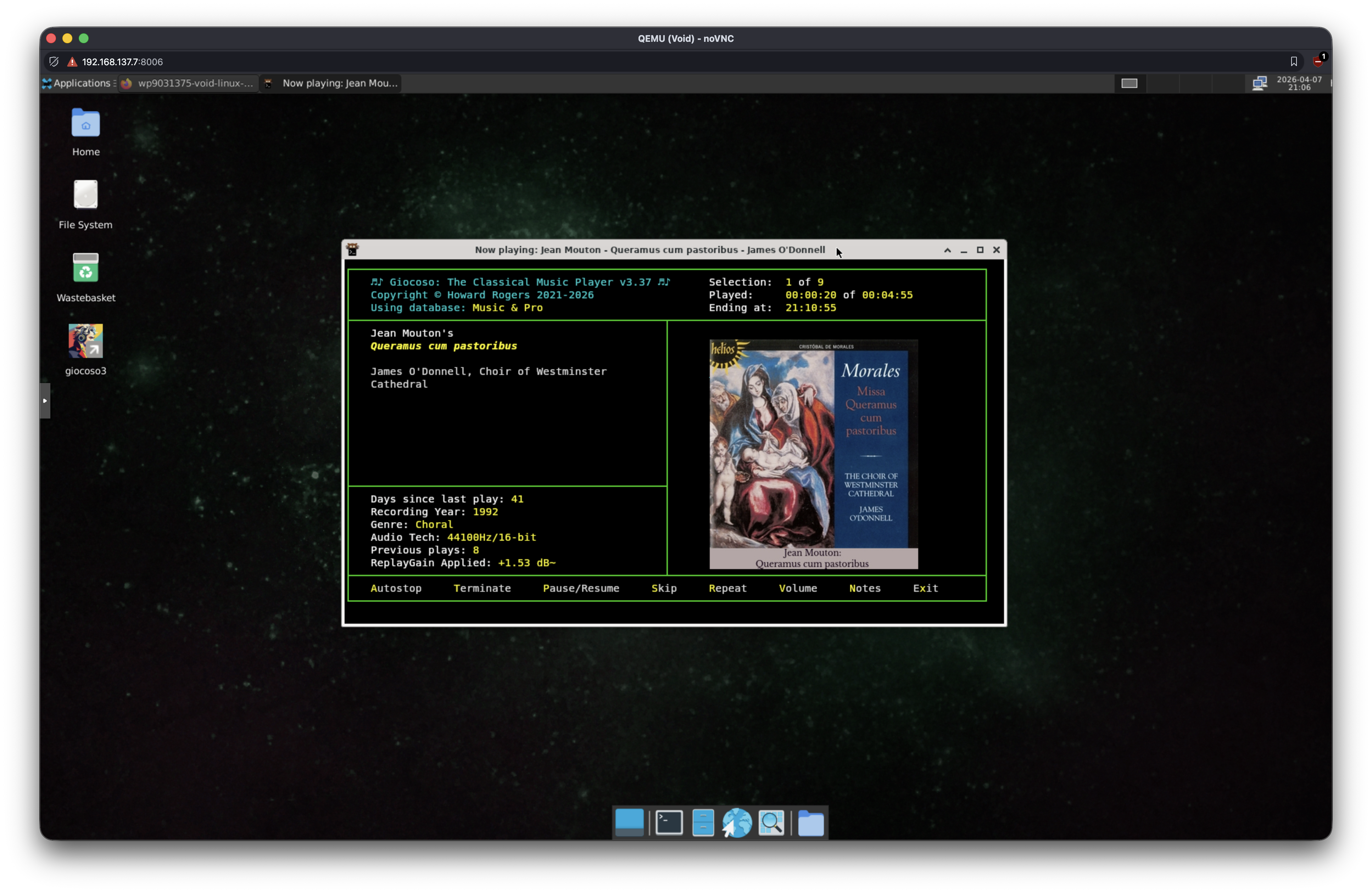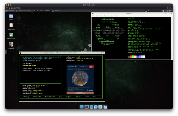 This is a quick note to mention that I've just added Void Linux to the Tier 2 support layer for Giocoso. That means I've spun the distro up in a virtual machine, installed Giocoso on it and got it to scan for music and then play some, in both Pro and non-Pro modes: