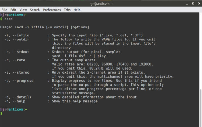These commands merely remove the source code folders, not the installed, compiled executables. If you type the command sacd at this point, you should see the display of advice on how to run the program properly shown in the first screenshot of this section.