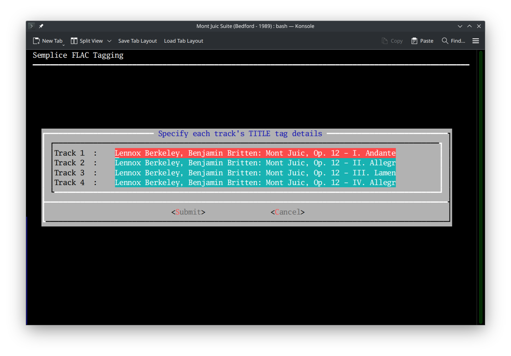 If you click Cancel, your data entry up to that point is lost and nothing is written to the FLAC files: you are returned to Semplice's Tagging menu without any file alterations having been made at all. If you click the Submit option, however, then your data is saved to memory -but not yet written to the FLACs themselves (so, if you accidentally press [Submit], you can then press Ctrl+C to terminate Semplice entirely, and your FLACs will still not have been altered).