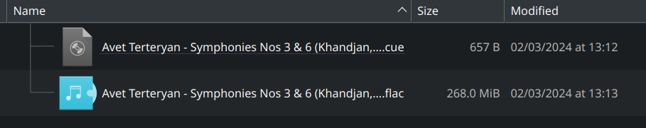 So, you (and any music player that can understand cuesheets!) can see that there are four tracks contained 'within' the one FLAC file, three belonging to one symphony and the fourth belonging to a different symphony. Some music players can interpret cuesheets directly: