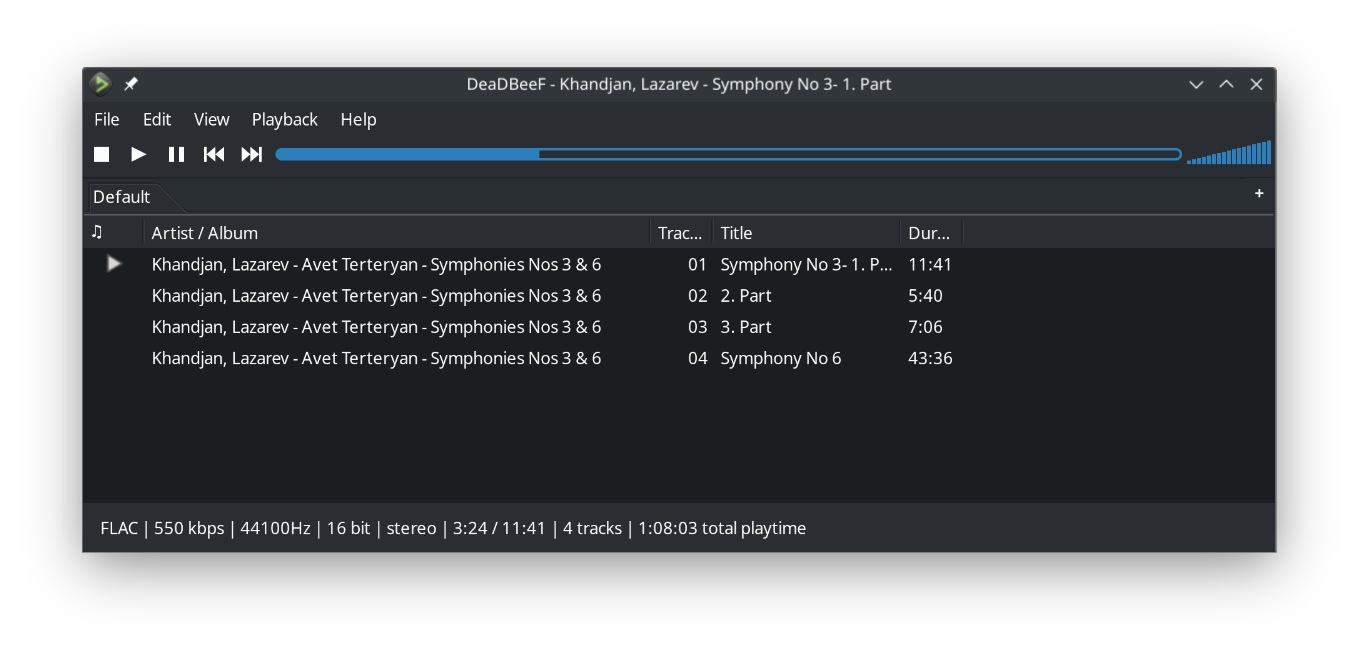 In case you missed it, Track 1 used to say “Symphony No 3-1.P…” and now says “Symphony No 3: Part 1” and in the title bar of the DeadBeef window, it used to say “Khandjan, Lazarev” and now says “Lazarev Khandjan”.