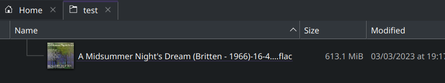 Here we have a folder full of …just a single 600MB+ FLAC file. There's no cuesheet visible in the file manager at all. Let's take Semplice's Tagging menu Option 9 now: