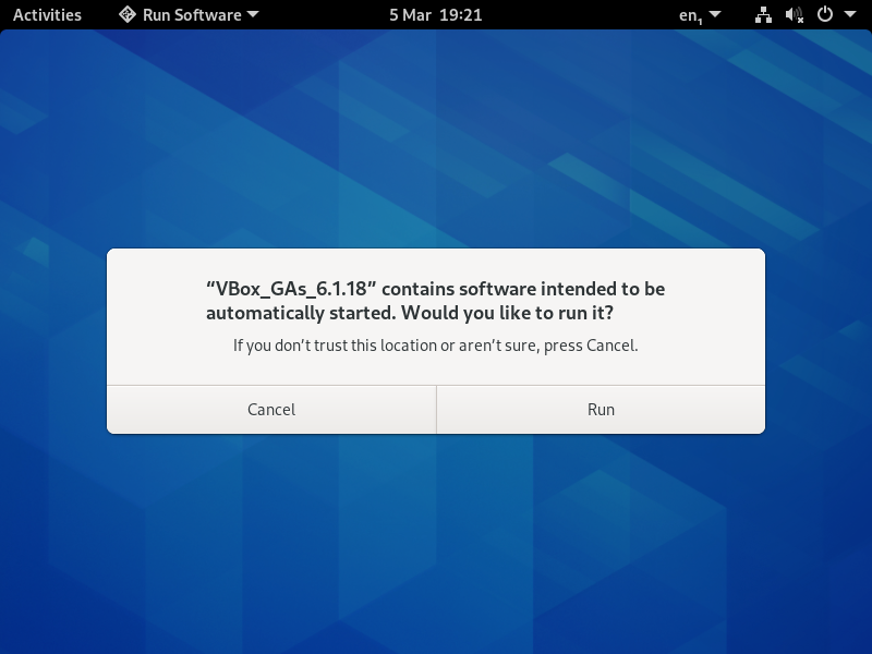 Click [Run] when prompted. You'll then have to supply your non-root user's password to authenticate and the VirtualBox Additions process will then take place automatically: