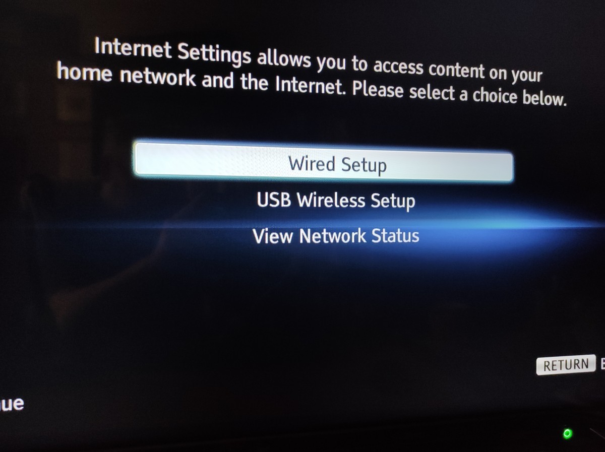 As I mentioned above in Section 2.3, even if a wireless networking capability is available, I'd strongly recommend using a wired network connection, assuming you have ethernet cables and switch or router ports available! Thus, I'm taking the 'wired' option you see here. Often, as in this case, the player manufacturer will guide you to setting things up in an automated fashion: