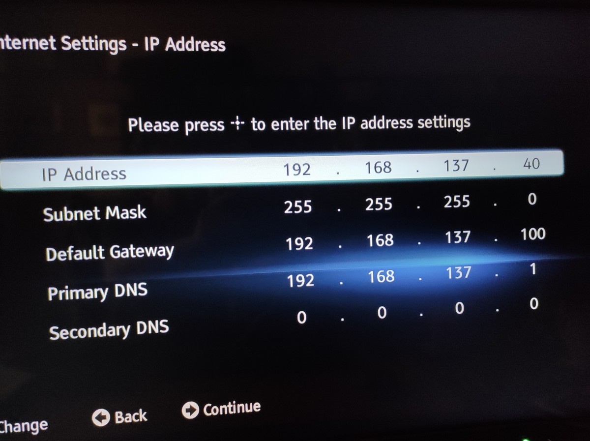 Think of it like a street address: 156 Acacia Avenue. Which part of that is the 'general' address where lots of people live, and which is the specific bit of the address that identifies your house exactly? In this case “192.168.137” identifies my network generically. It means all computing devices I want talking to each other have to use that exact same general address component. But the “13” bit identifies my PC uniquely within that general 'street address'. That means my Blu-Ray player will need an address of 192.168.137.something, but the 'something' must not be '13': that's like having squatters trying to move into your house while you're still trying to live there! Pick another 'house number', therefore: it doesn't matter specific which one you pick (and remember, there are around 256 to choose from), but nothing else must be using the one you decide to pick.