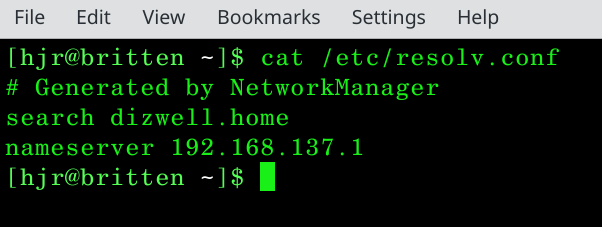For the other two bits of networking information, some additional commands are needed: cat /etc/resolv.conf will tell you how your PC resolves 'wordy addresses' into 'number IP addresses': how 'www.google.com' is turned into the address 142.250.200.4, for example: