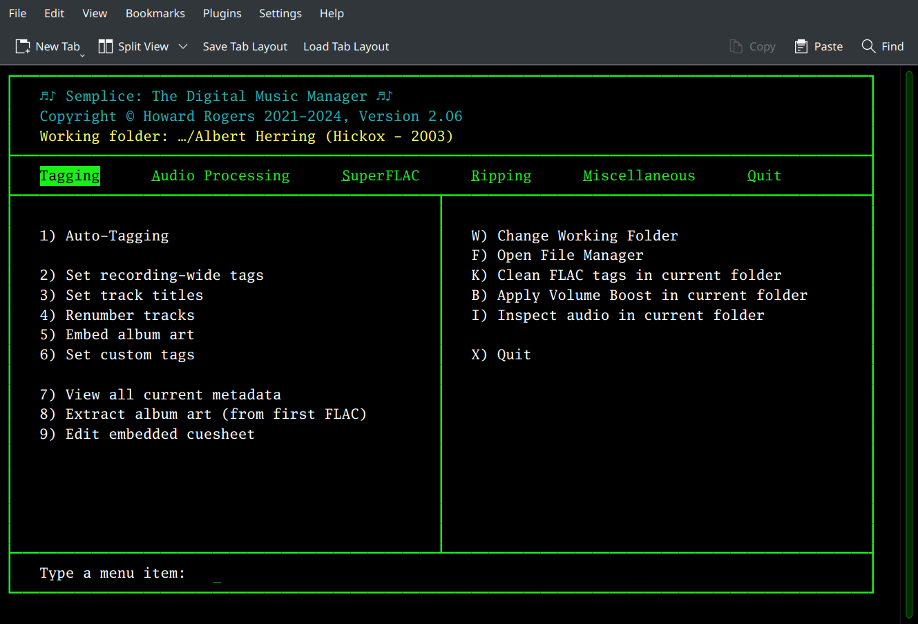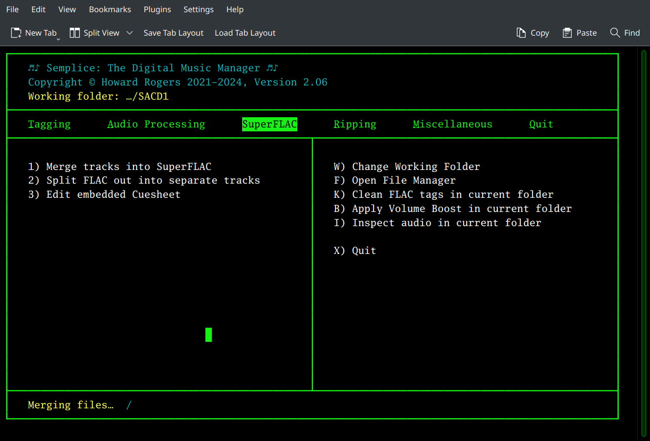 Remember, too, that though SACDs automatically supply plenty of metadata tags for your newly-ripped music files, most of it is complete garbage and will need to be corrected by manually tagging the files after the rip is complete: Semplice has you covered there, too (just use menu options 1 to 9 to tag your FLACs with more suitable metadata).