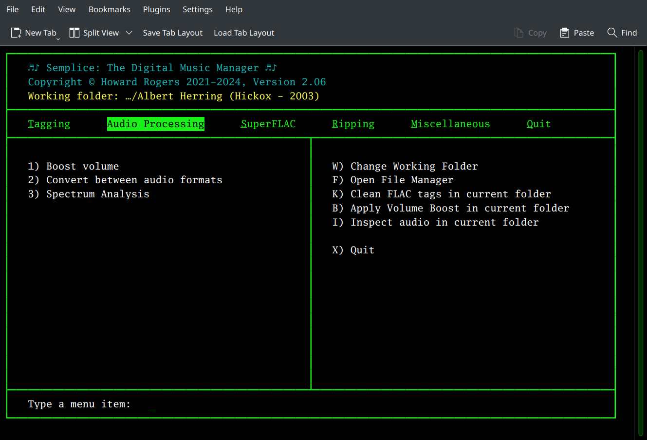 Semplice lets you do lots of different things with your digital music files (such as tagging them and giving them a volume boost), but the main thing to worry about now is to go to the Audio Processing menu (tap the letter 'A' or use the right- and left-arrow keys to get there):
