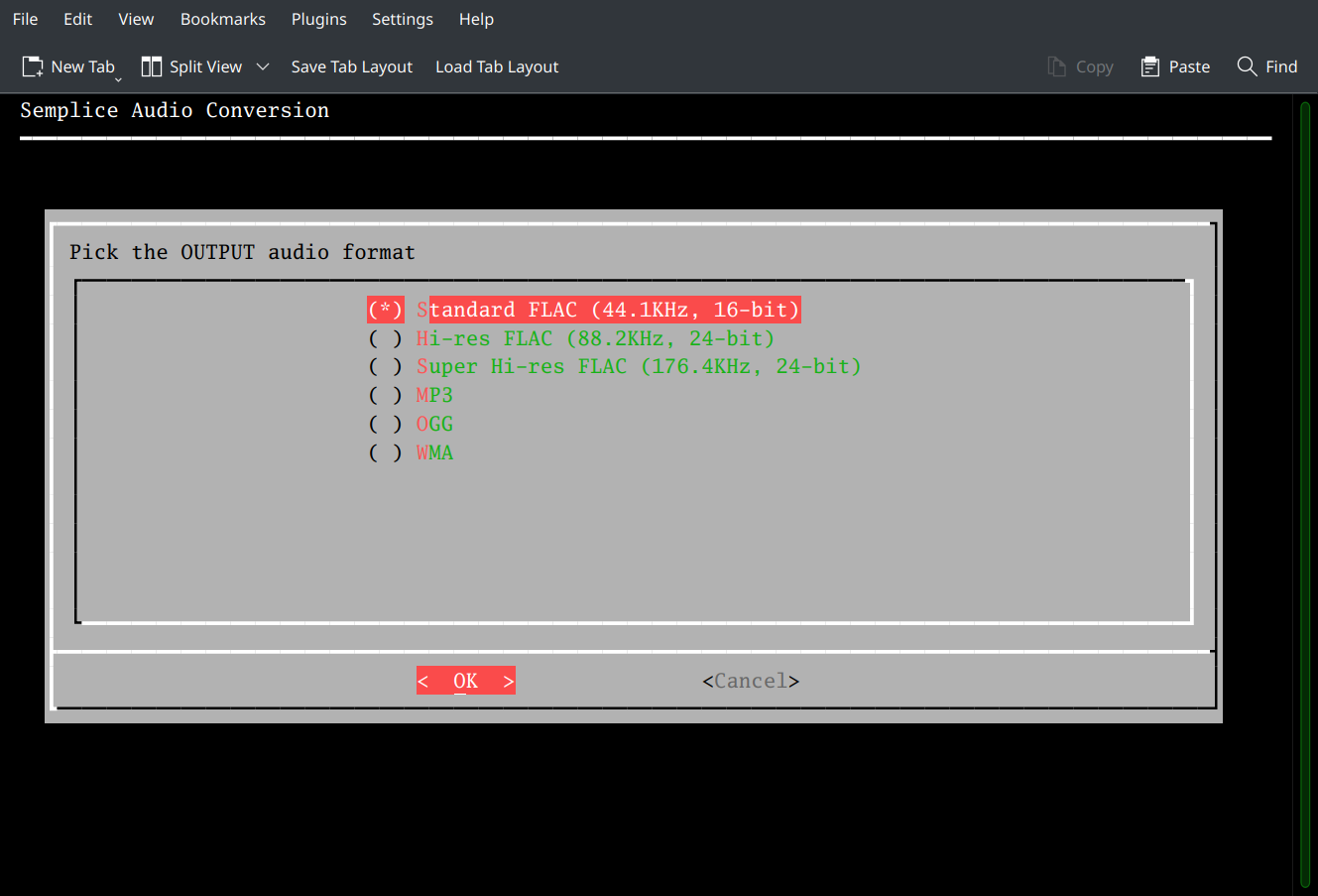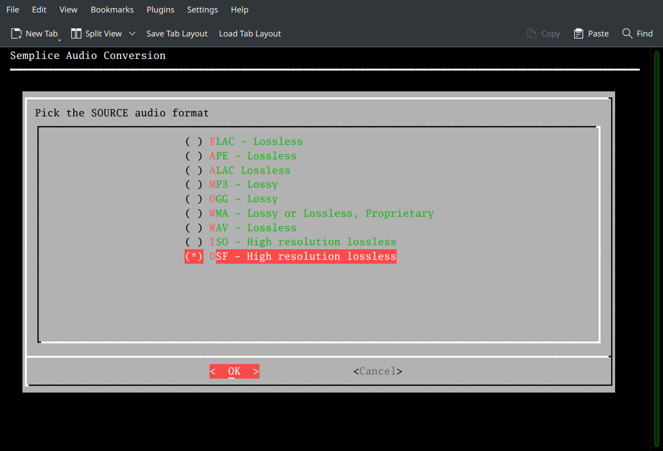 Arrow-down to select the appropriate source audio format and press the Space Bar to select the appropriate one: an asterisk will appear next to the selected item. In this screenshot, you can see I've selected the DSF format item. Note that I could equally well have selected the ISO option, if I'd ripped to that format, too. Press [Enter] to submit your selection. The screen changes to display all the possible output audio formats: