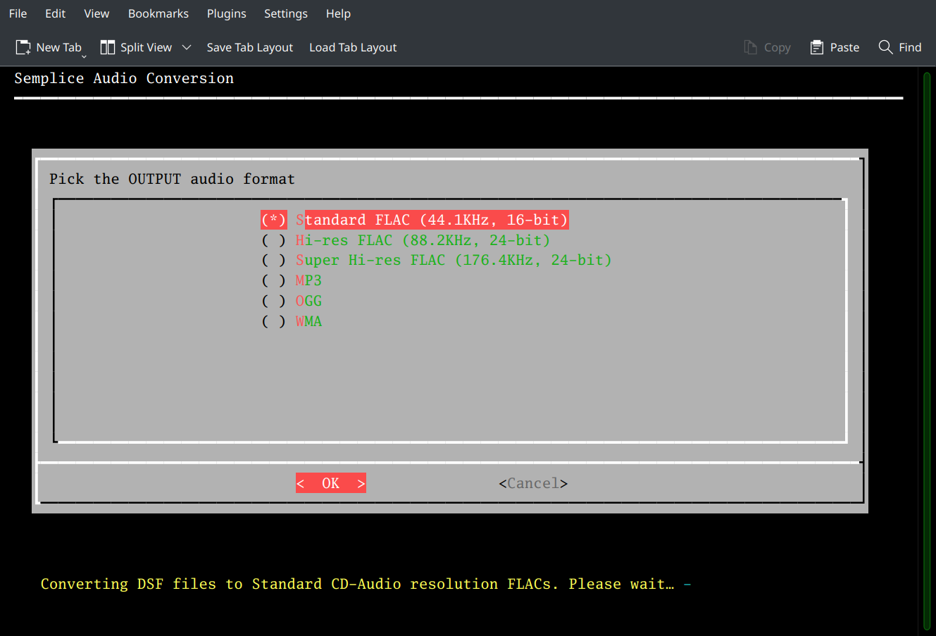 So, let's assume for now you've ripped your SACD to separate DSFs. You now want to convert them to a format that practically all music players can handle without drama: FLAC. I have a piece of software to do that, called Semplice, freely available from this very website. Install it with the commands: