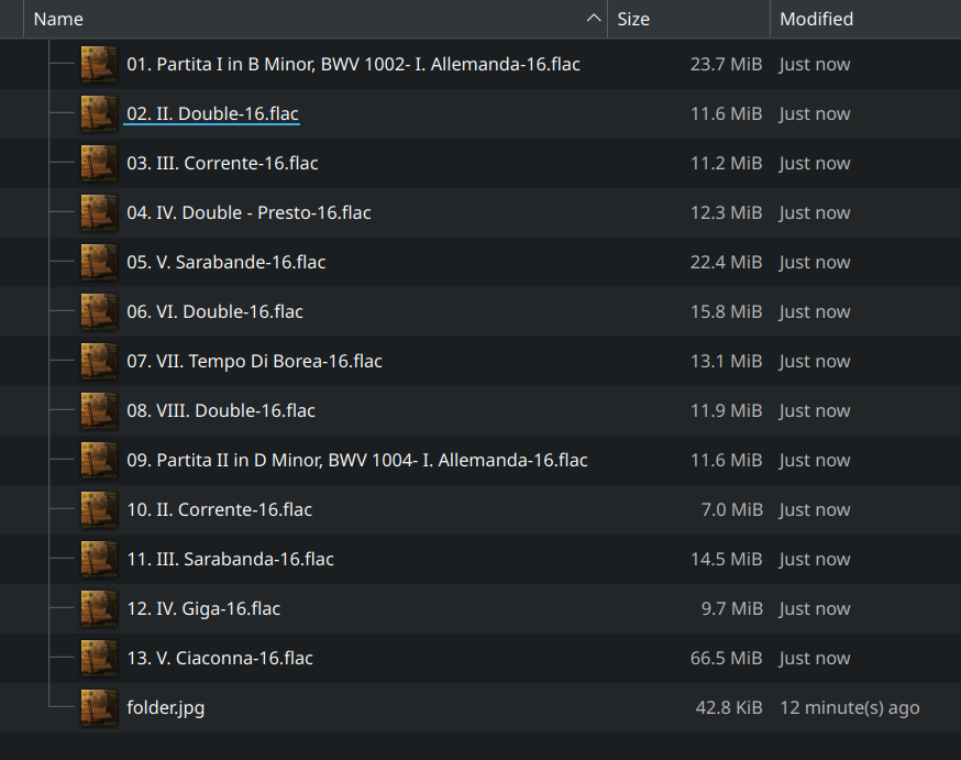 As these numbers scroll off the screen, you'll notice a new folder has been created (within wherever your -o switch said to put the ripped music). In my case, as you saw above, each new disk produced a new 'Secular Cantatas Vol. x' sub-folder, and within each of those sub-folders, as the rip progressed, things would appear, like so: