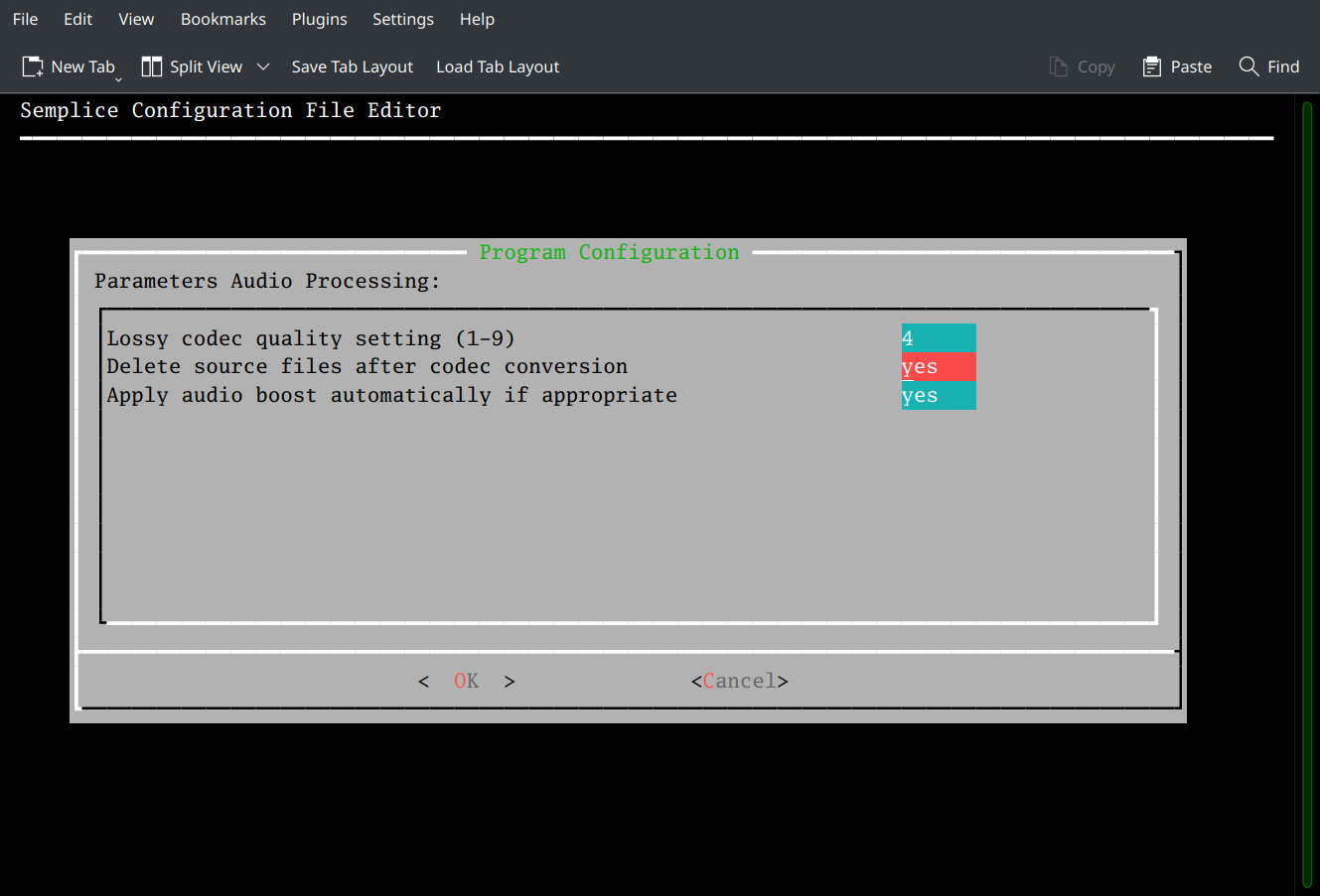 That last option, 'Apply audio boost automatically if appropriate' is, by default, set to 'no', which is why when I took the option to volume boost, Semplice analysed and then asked me if I wanted to apply the boost. If I were to set this configuration parameter to 'yes', then when I take the option to volume boost, Semplice will analyse the files exactly as before and, if it determines that a volume boost can be applied, it will apply it without asking you whether you want it to go ahead. It still won't delete the original files without asking, however. It's just a little bit more convenient to create the db-prefixed files automatically without extra prompting, but you're definitely still in control over whether the originals or the volume-boosted files are the ones you want to live with.