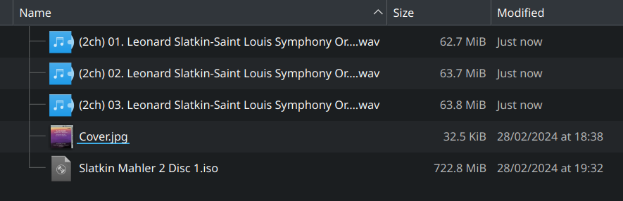 Towards the bottom of this screenshot of my file manager, you see the DSF output of the second volume of Bach's cantatas as before: a folder called 'Stereo', and within that, a bunch of individual DSF files. Above this, however, I've also ripped the second volume to an ISO: and you'll note that you get a single sub-folder containing the recording name and then, within that, a single file using an ISO extension.