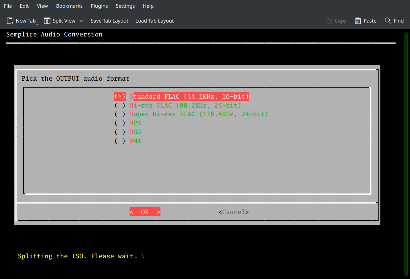 Certainly! Again, cd to the folder containing the ISO before launching Semplice. Use the Audio Processing menu, Option 2 once more. Select ISO as your input format and whatever you fancy as the output format. This time, as soon as you press [Enter] with a selected output format, you'd see this: