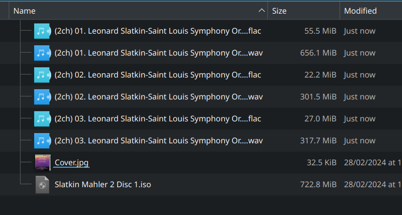 You'll immediately notice that whilst I now have a nice set of FLACs, the WAVs have entirely disappeared! However, the original ISO is still there on disk -and this is why it's quite safe for the WAVs to be automatically deleted: they are only an intermediate file between the ISO and the end-result FLAC and could always be re-created by asking for a fresh conversion from the source ISO which, you'll note, has not been auto-deleted.