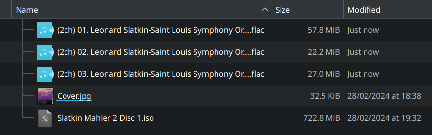 On this occasion, the original ISO is left behind on disk, too, from before… but all the per-track FLACs have indeed been deleted. So you now have a FLAC equivalent of the ISO originally ripped from the SACD, but (as you can see) it's much smaller in comparison, which your hard disk will thank you for!