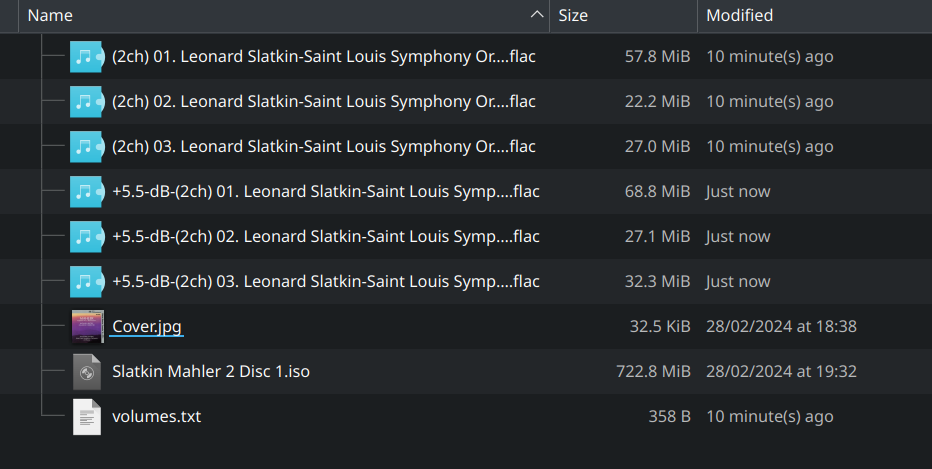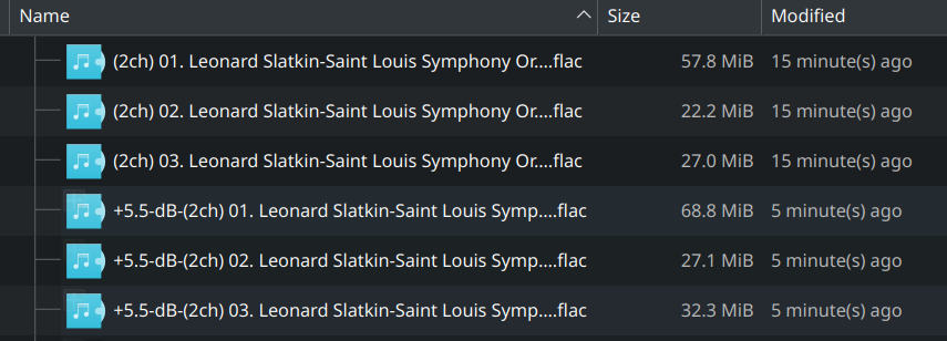You'll notice that the original FLACs are all listed in the folder as before, but they've now been joined by equivalent FLACs with a prefix that represents the volume boost amount: in this case, three FLACs now exist with a “+5.5-dB” prefix. The originals are therefore quite safe at this point: Semplice is creating new files that are volume-boosted, not altering the originals.