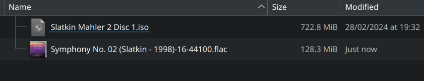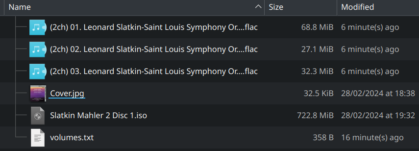 You'll see the three source FLACs (plus the ISO they came from), sitting alongside the new 128.3MB FLAC, whose name is the same as the ALBUM tag assigned to the first FLAC in the folder. A bit of mathematics tells you that 68.9+27.2+32.4 = 128.5MB, so you can see that, give or take a bit of rounding by the file manager, the symphony-named SuperFLAC really does contain all the data stored in the 3 separate per-track FLACs.