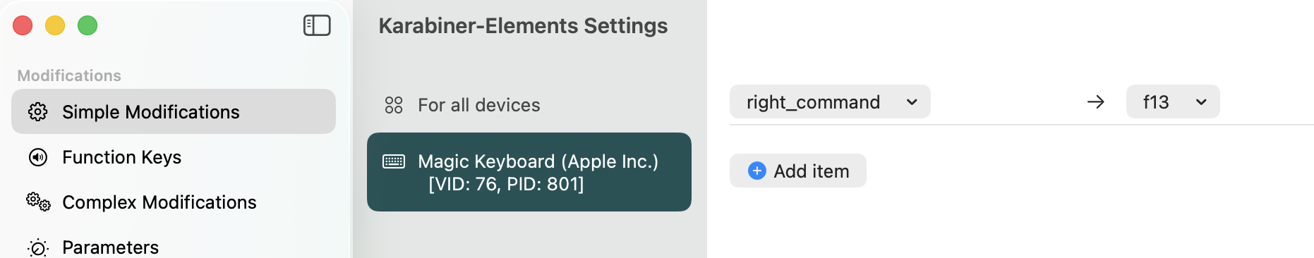 That “\UF710” is the Unicode binding for F13. The file is basically saying, “When you see F13 pressed, do the following textual substitutions for whatever is typed next”… and then goes on to list something like 4000 possible substitutions to do! The trouble is that if your Apple Magic Keyboard is like mine, it won't have an F13 key. That, however, is where Karabiner Elements comes into effect: you run the program and create a new Simple Modification that maps the right-Command button to F13:
