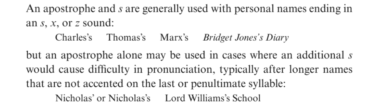 # For apostrophes, if a word ends in single-s, add only an apostrophe. If it ends in ss or not in s at all, then it's apostrophe+s.