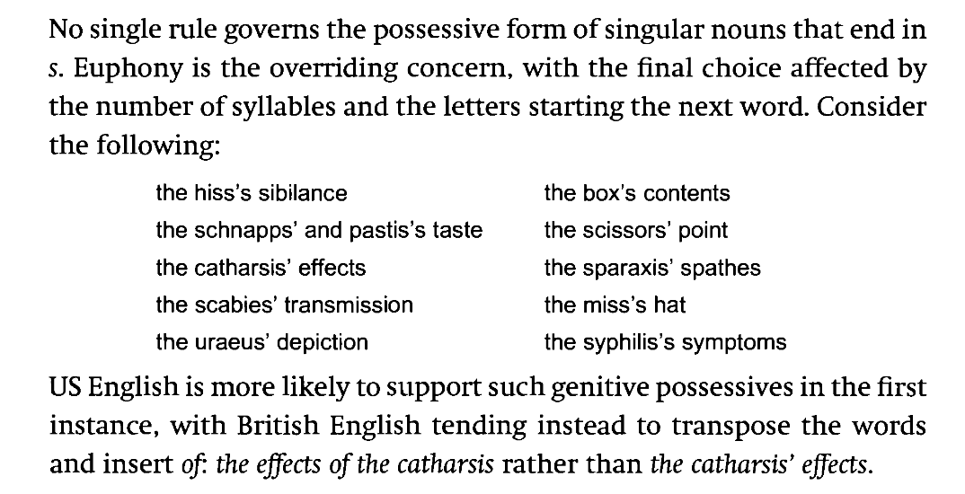 I have recently become somewhat embroiled in a bit of controversy over the correct form of possessive to use when dealing with singular nouns and names that end in single-s: I thought it might be worth documenting my viewpoint and the justification for it. First things first, then: in the 1970s my grammar school taught me a very simple, three-part rule: