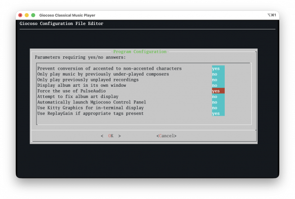 To be clear, for any of this to work, the persistent configuration parameter Force the use of PulseAudio must be set in full-fat Giocoso’s configuration settings: