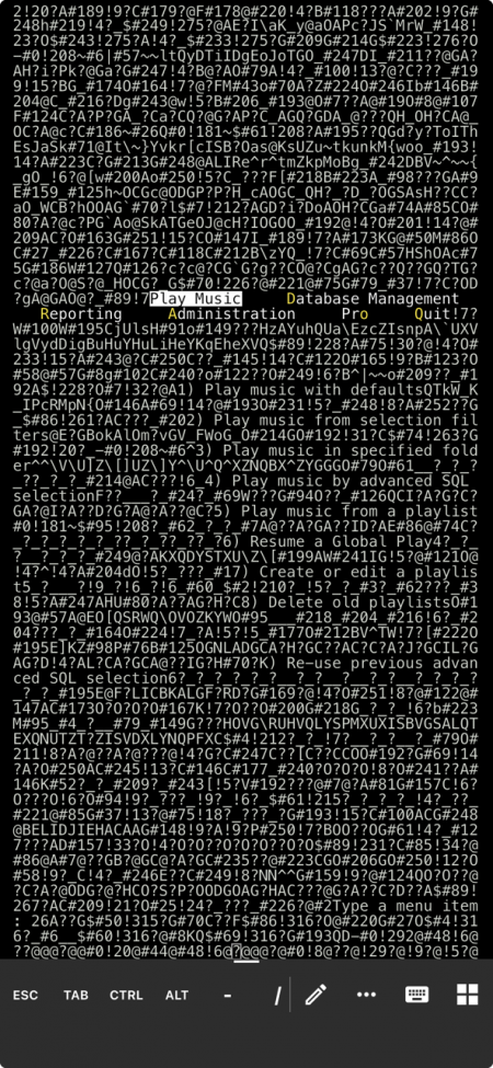 It reminds me of the Rosetta stone, only somewhat less translatable! You might just be able to pick out the standard Giocoso main menu: Play Music, Database Management and so on. But the rest of the display is just junk, for the simple reason that there's no Android or iPhone terminal emulator I know of that knows how to display sixel graphics properly. What you';re seeing here, therefore, is how a non-sixel-enabled terminal handles displaying the Giocoso program logo. The same thing happens if you start playing a recording and Giocoso tries to display its album art in-terminal.