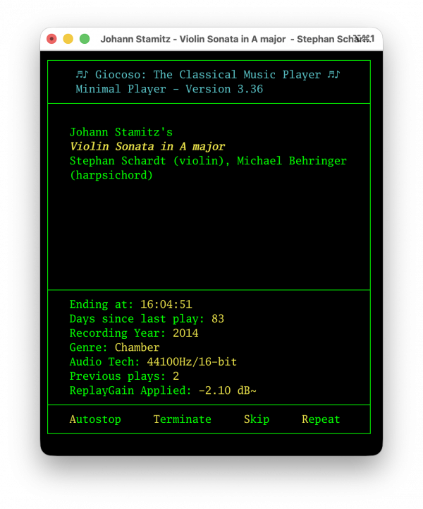 Much better! Intelligible output, displaying what the main Giocoso running on the machine I've ssh'd into is already playing, and giving you the ability to pause, skip, terminate or repeat that play, too, all contained within the device you probably already carry with you everywhere. What's not to like?!