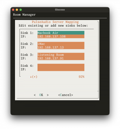 You’re allowed to create up to five ‘sinks’ on this screen: their labels are up to you, but must be less than 14 characters long (they’ll be truncated otherwise). Each label is then paired up to the IP address of the device to which the label applies. Those rather obviously need to be fixed IP addresses (or, at least, addresses with DHCP reservations) so that they don’t change after initial setup: Giocoso on the playing PC needs to be able to find it on the network so that the audio can be sent to the right place.