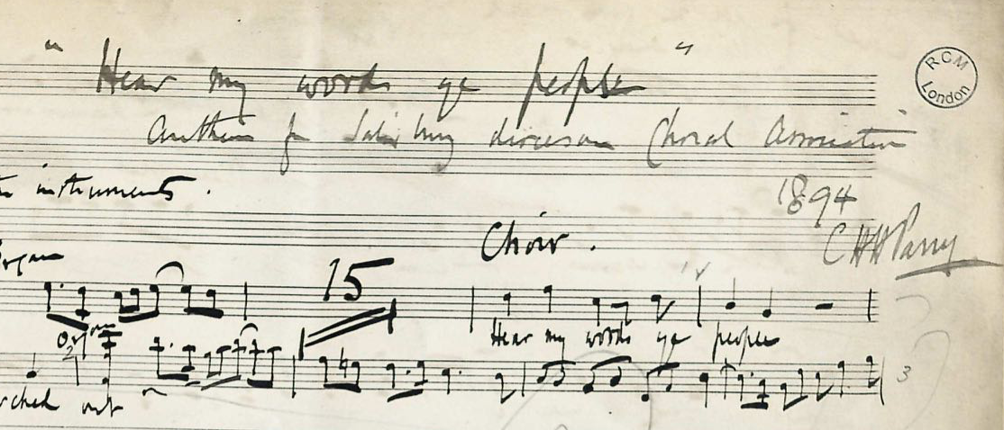 If we look for clarification at the front page of any of his published scores, you will get mixed results, too. Printed front matter almost invariably lists him as C. Hubert H. Parry, which means the 'optional' names were certainly truncated into mere initialisms, but they're still used nonetheless. Indeed, on the front page of the manuscript of the anthem 'Hear my words ye people', we see this:
