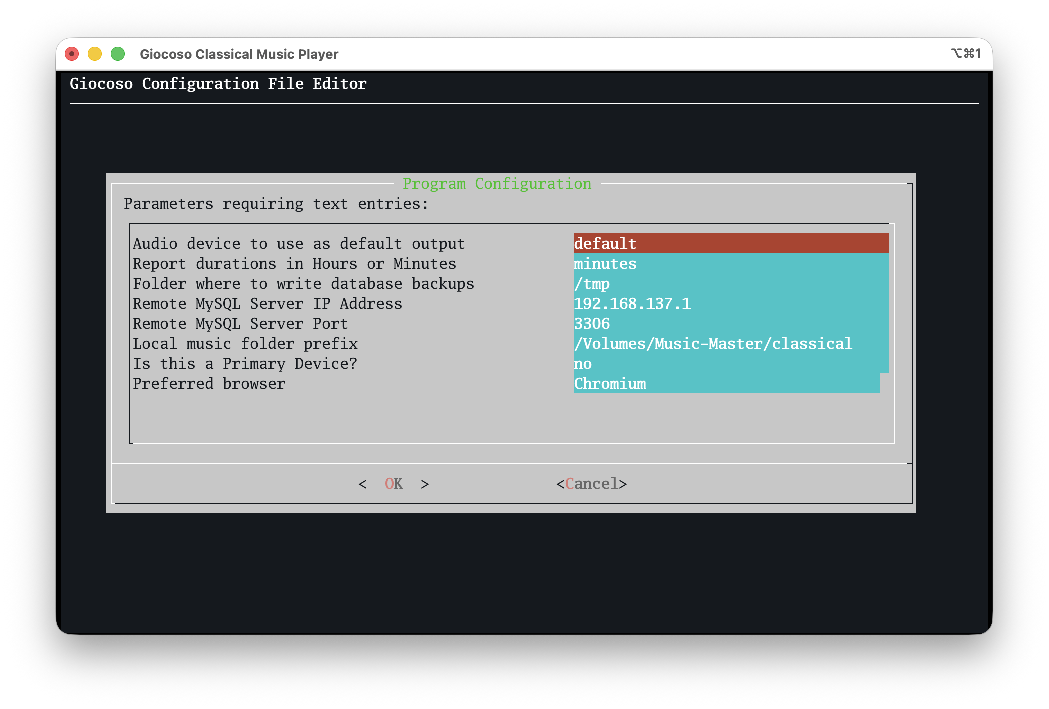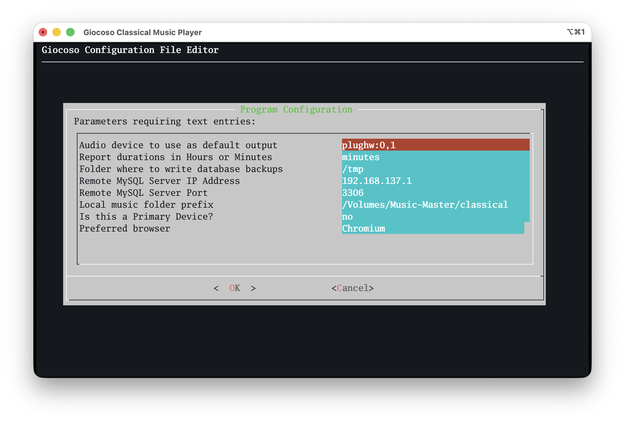 The Local music folder prefix parameter is also related to Giocoso Pro functionality. The idea of having a remote database is that it can be shared amongst different PCs: my garden shed computer can play music sourced via the one, central database just as effectively as the PC in my main listening room. However: my garden shed computer may access its music at (say) /home/hjr/Music/classical whereas my listening room PC finds its music at “/music/classical”. What we need to specify for this parameter, therefore, is the bit of the path to music files that is unique to each PC. In my case, that would be “/home/hjr/Music” for the garden shed and “/music” for the listening room. The Pro database can therefore tell either PC to play music from “A/Aaron Copland/Ballet/Rodeo” and each PC will prepend the 'local prefix' to that, to arrive at '/home/hjr/Music/classical/A/Aaron Copland/Ballet/Rodeo' and '/music/classical/A/Aaron Copland/Ballet/Rodeo' paths respectively. One shared database can thus tell multiple differently-configured PCs how to find the same music files with this parameter.