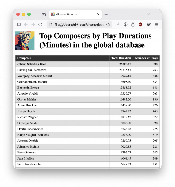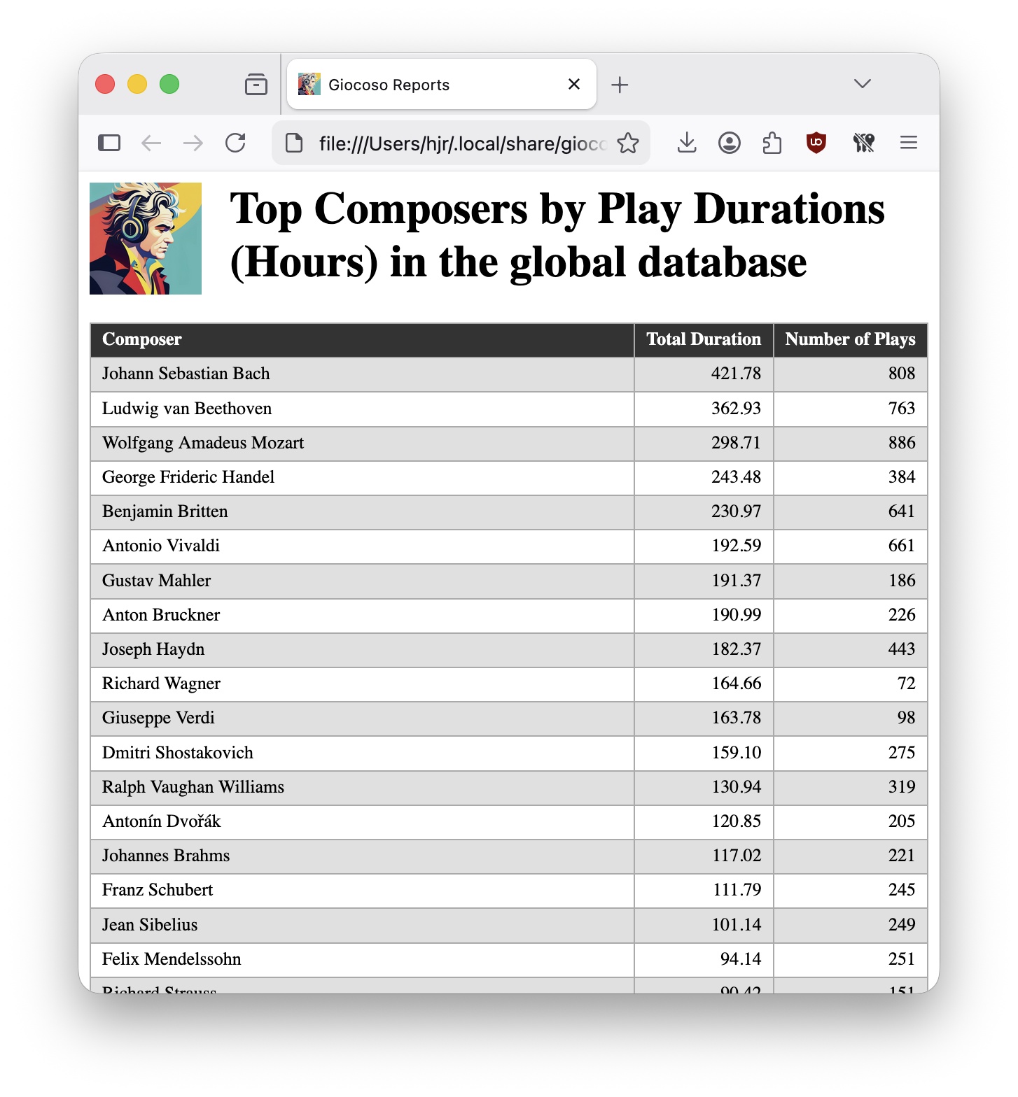 You can see I've played Benjamin Britten 641 times, amounting to a cumulative play time of 13,858.02 minutes. That's the sort of display you get, then, with the Report durations parameter set to 'minutes'. Change it to 'hours' instead, and re-run the report and you'll see this instead: