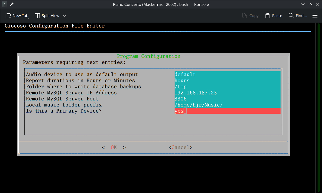 Note the implication here: if Device A refreshes itself, it wipes and replaces the global_recordings table that all devices see and use. If Device B then comes along and refreshes itself locally, it too will want to wipe and replace the global_recordings table… and so on for every other device. The assumption underlying Giocoso Pro, however, is that all devices see the same digital music collection, so Device B really didn't need to do a refresh at all if Device A had already done it: they'd both be scanning for the same files and both would discover the exact-same number of music files. In other words, in a Giocoso Pro environment, the sensible thing to do is to pick just one device to be the one that does routine refreshes: all other devices just need to be pointed to the global database to get their source of plays. They themselves do not need to perform routine refreshes to pick up the latest arrivals to the collections, provided only that one designated device has done so. For this reason, the Administration menu, Option 2 allows you to designate a Giocoso installation as being a Primary Device: