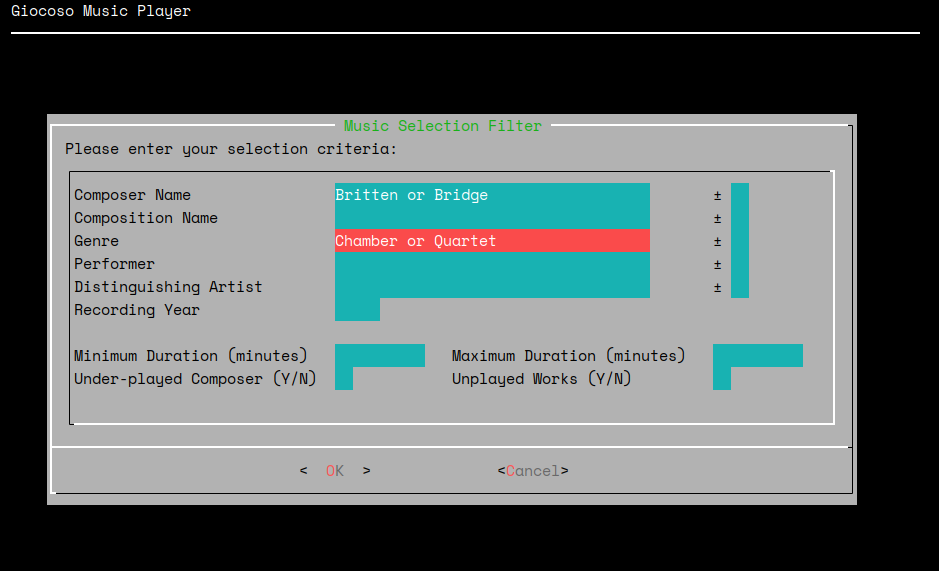The same is true for the GENRE tag: you'll probably have tagged your music as either being a 'Quartet' or as being 'Chamber' music, but it's highly unlikely that you'll have tagged any of it with the literal text 'Quartet or Chamber'. If you didn't, then nothing is going to match the filter settings on this screen!