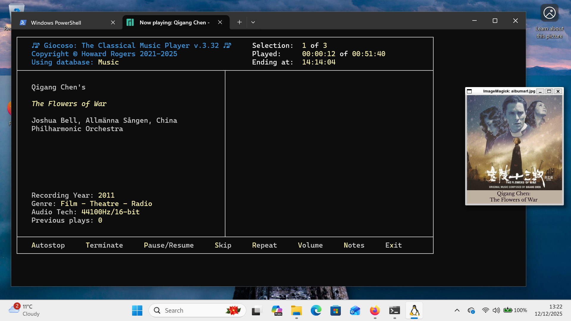 It is at this point that you'll discover that 'non-standard' distros have non-standard quirks! In this case, you can tell that music is playing fine: the counter in the top right of the Giocoso screen is saying we're six seconds into playing a 51 minute recording, for example. But you'll notice that there's no album art: that's because Manjaro-on-WSL's default terminal is not configured to display 'sixel graphics', Giocoso's default mechanism for displaying graphics within a terminal.