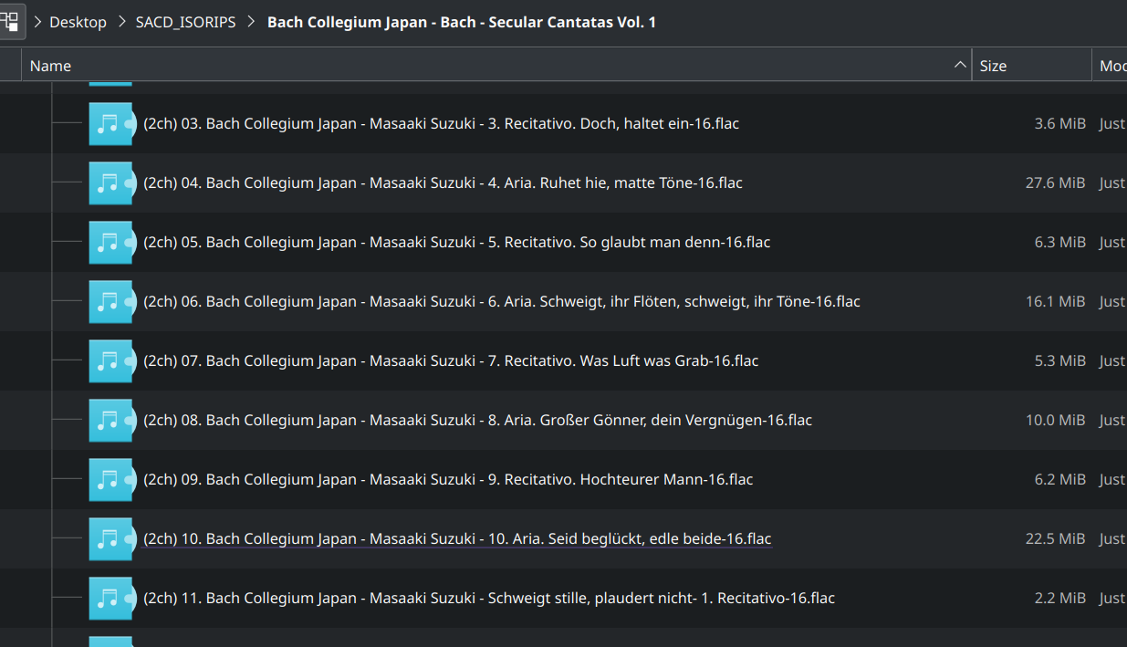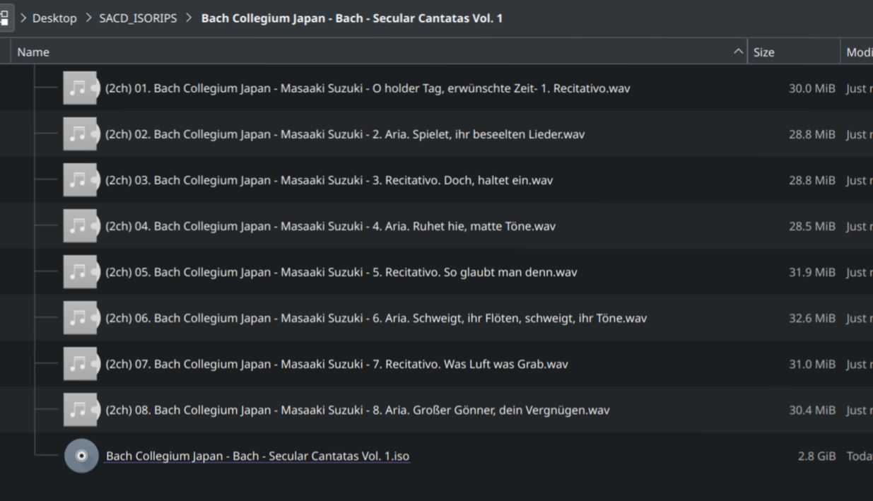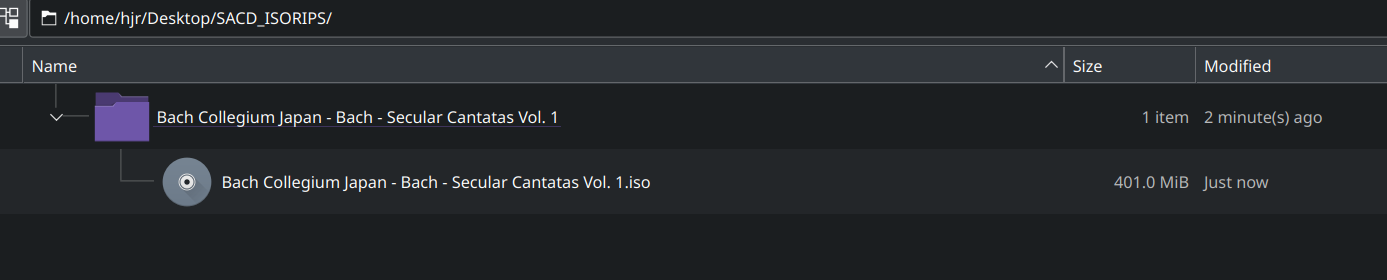Here, you see that I specified /home/hjr/Desktop; Semplice has created a /home/hjr/Desktop/SACD_ISORIPS sub-folder, and within that sub-folder, a 'Bach Collegium Japan…' sub-sub-folder has been created. That sub-sub-folder name is dependent on the SACD being ripped: they all come with metadata about the artist and composer (usually very poorly and inconsistently done!) and Semplice just uses that to create a folder whose name matches the disk being ripped.