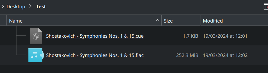 …which is exactly the same as what happens when the cuesheet is embedded! The 'splitting masterfile…' message appears and is eventually followed by a confirmation message. Looking back in the file manager, we see: