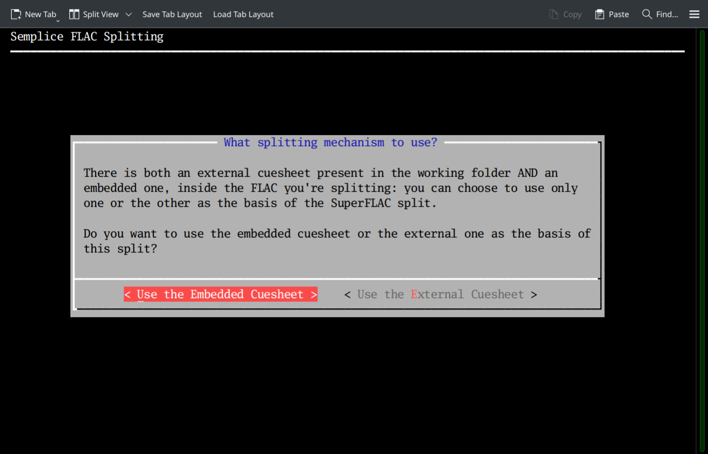 A second scenario arises where your FLAC contains an embedded cuesheet and the file system has an external cuesheet to hand: the natural question is which one to use when splitting the SuperFLAC? Well, Sempice can't guess, so it asks:
