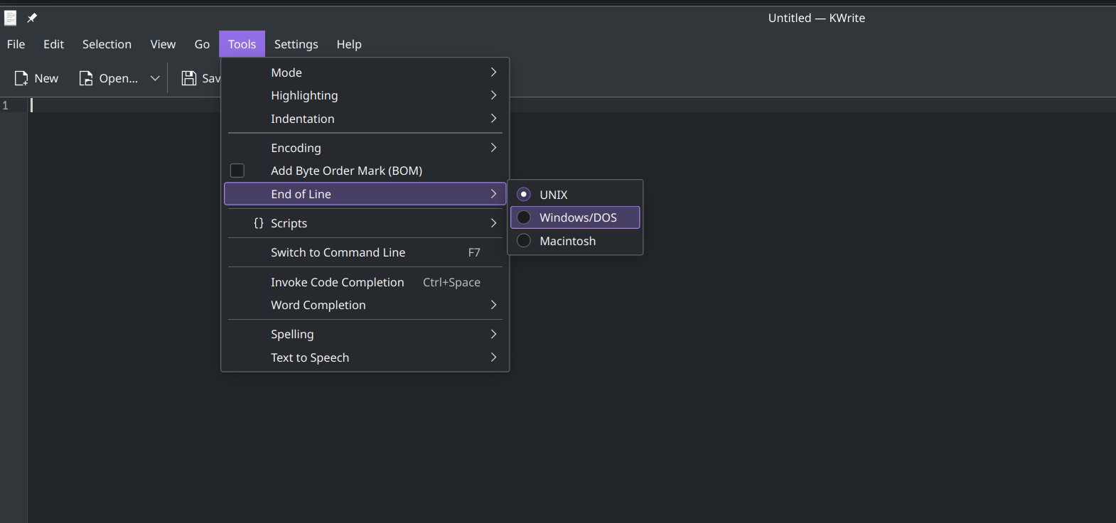There are a couple of scenarios where things might not go so smoothly, however. The first one is if the external cuesheet is in a weird format: if Semplice cannot parse it correctly, it will either bomb out with an error, or the split folder it creates will end up not containing anything. There's no real fix for that: it's up to you to obtain a cuesheet that parses correctly because it uses the correct syntax (which is rather convoluted!) One common error I've encountered, however, is that the cuesheet is often prepared by someone who was obviously using Windows. Windows ends lines with a carriage return and a line feed character (CRLF); Linux generally ends lines with simply the LF character; macOS tends to use just the CR one. Some text editors let you swap between the different line endings, so sometimes its enough to find your text editor's line-ending setting and flip it from one to the other and save the resulting change. Here's the option in Kwrite (and Kate), for example: