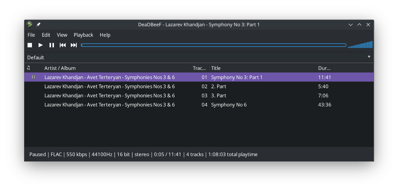In case you missed it, Track 1 used to say “Symphony No 3-1.P…” and now says “Symphony No 3: Part 1” and in the title bar of the DeadBeef window, it used to say “Khandjan, Lazarev” and now says “Lazarev Khandjan”.