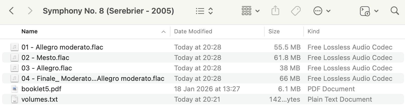 The first thing you'll notice is that only one set of FLACs remain: we had eight of them before but now only four remain. So, something's been deleted. A quick glance at the file names might lead you to think that it's the volume-boosted FLACs that have been deleted, because nothing now remaining is called '+.2-dB…'. Pay closer attention to the file sizes however: File 01 is 55.5MB, file 02 is 61.8MB, and so on. Go back a couple of screenshots and you'll see that those were the sizes of the volume-boosted FLACs, not the originals.